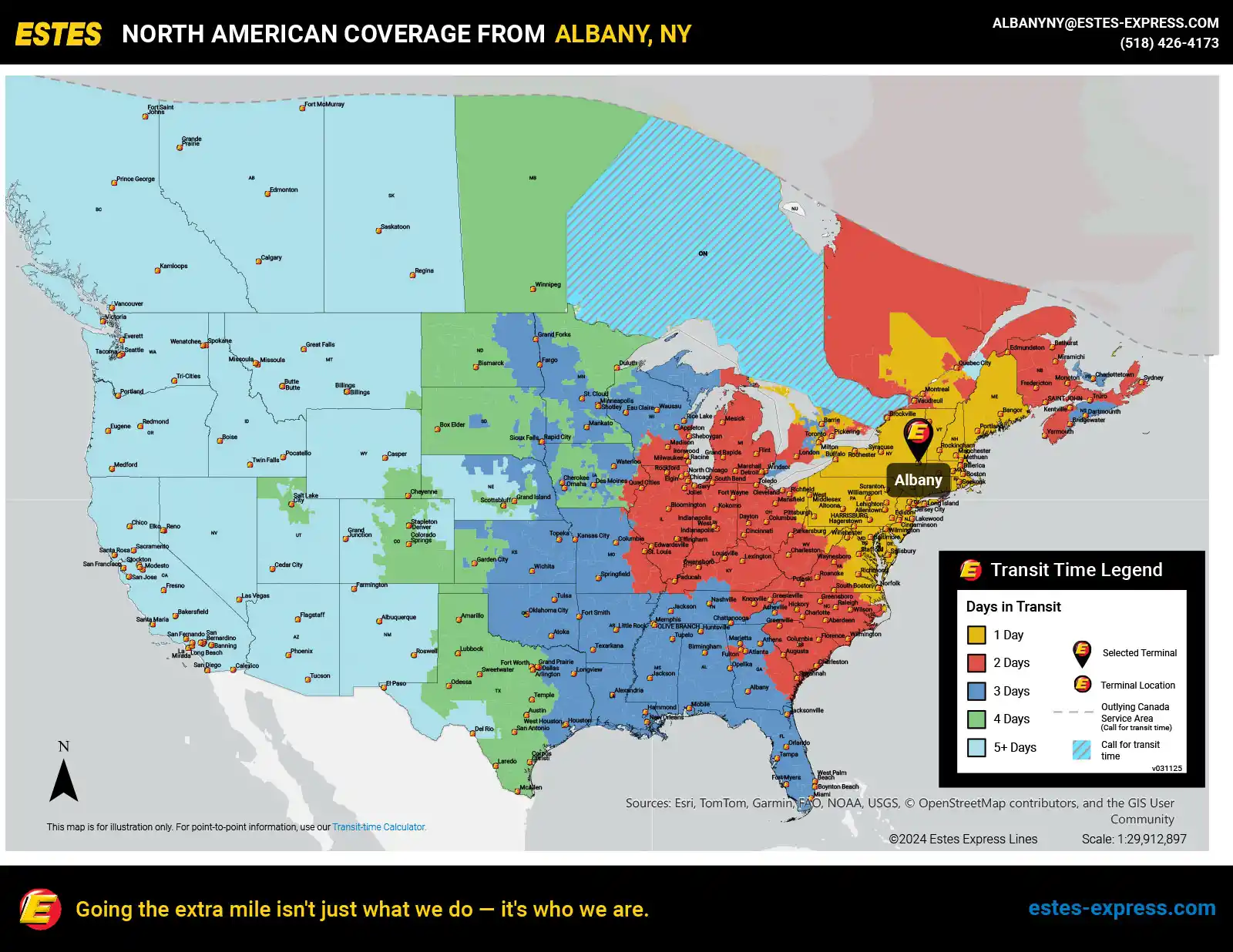 Estes offers next-day LTL freight shipping from Albany to NYC, Philadelphia, Boston, Toronto, Montreal, DC, Buffalo, Pittsburgh, Baltimore, Norfolk, Richmond, New Haven, Wilmington DE—and beyond.
