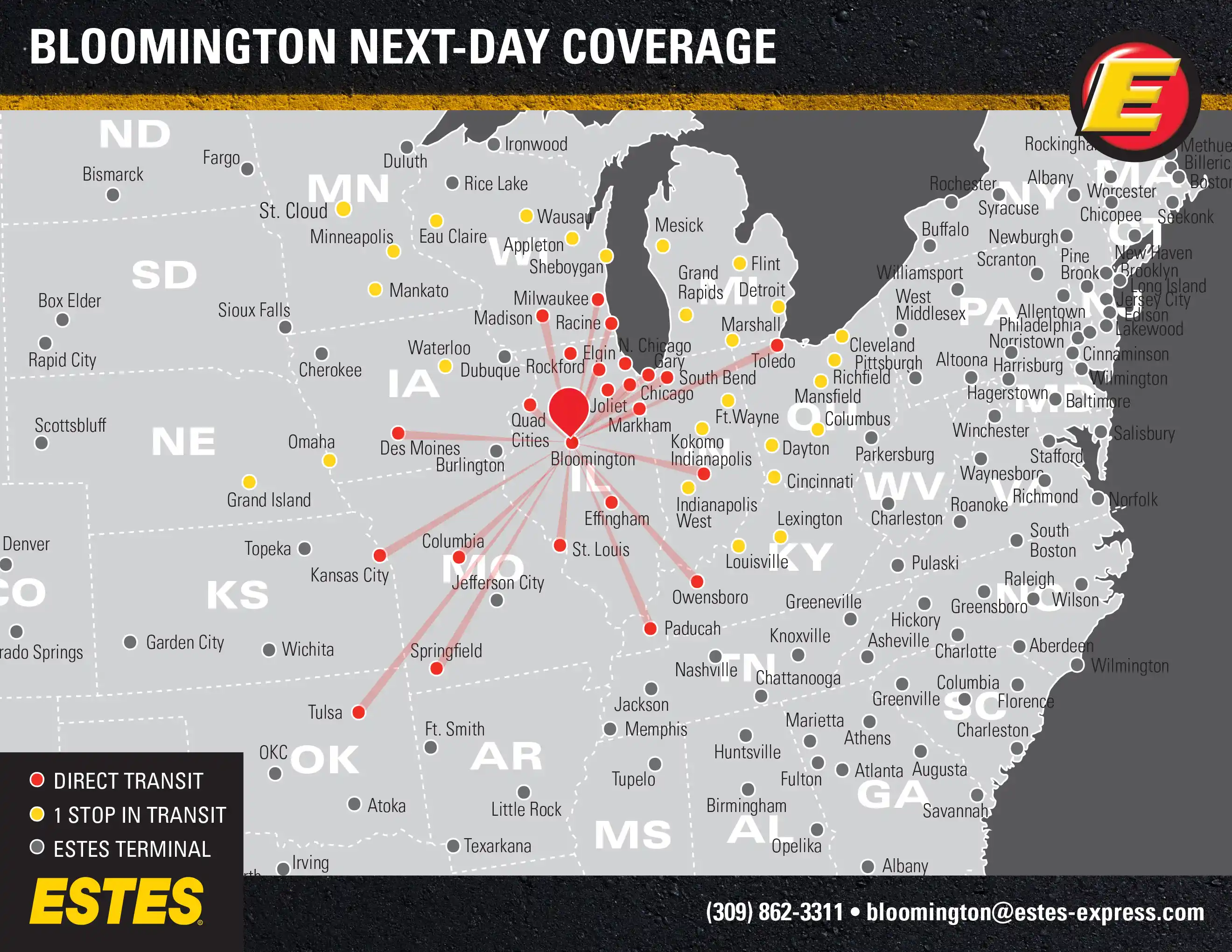 Need reliable LTL freight shipping? Estes offers next-day direct LTL from the Springfield-Peoria-Bloomington area to Chicago, Kansas City, Milwaukee, Tulsa, St. Louis, and Des Moines, as well as next-day LTL to Minneapolis, Indianapolis, Cleveland, Detroit, Cincinnati, Columbus, Omaha, Lexington, and Louisville.