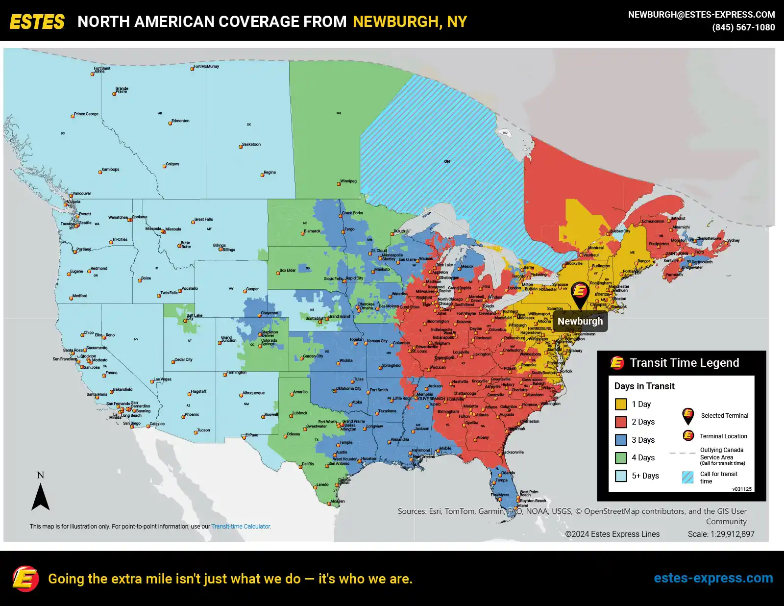 Estes offers next-day LTL freight shipping from the Poughkeepsie-Newburgh-Middletown area to NYC, Philadelphia, Boston, DC, Toronto, Montreal, Buffalo, Baltimore, Syracuse, Albany, Richmond, New Haven, Norfolk—and more.