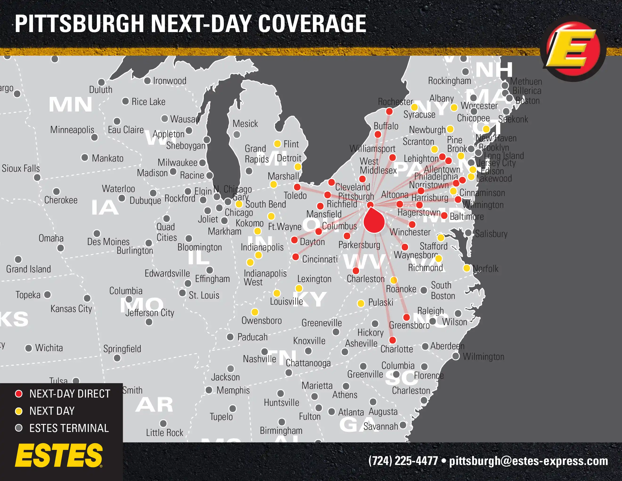 Estes offers next-day direct LTL freight shipping from Pittsburgh to Philadelphia, Charlotte, Cincinnati, Cleveland, Columbus, Baltimore, Toledo, and Wilmington, DE, as well as next-day LTL to Indianapolis, Detroit, Lexington, Louisville, Richmond, Norfolk, New Haven, and more. Learn about the benefits of shipping through this hub terminal.